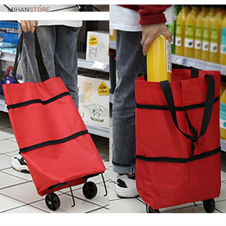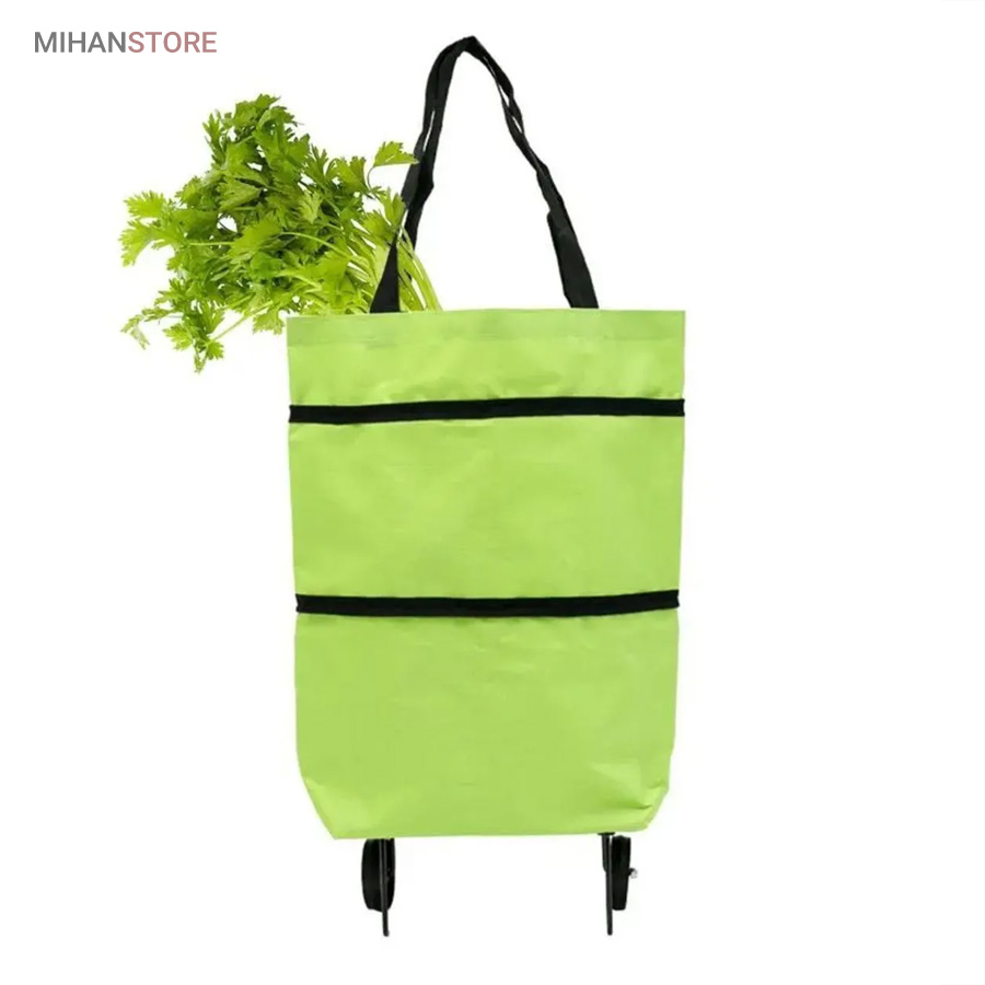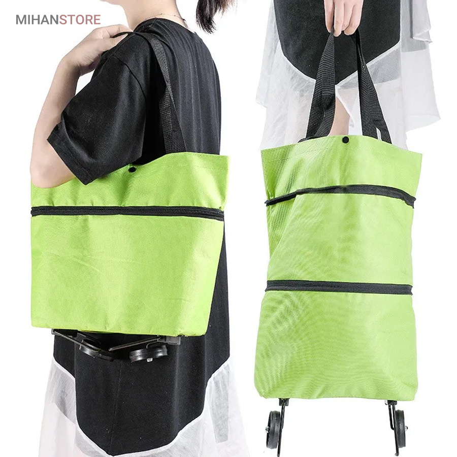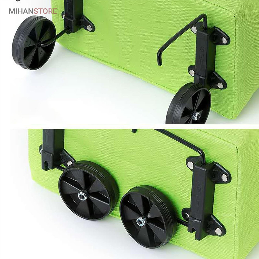کیف خرید چرخدار تاشو دارای چرخهایی است که به شما کمک میکند بدون اینکه وزن خریدتان را بر روی شانهها یا دستهای خود احساس کنید، خریدتان را بهراحتی حمل کنید. برای استفاده از ساک خرید در حالت چرخدار، کمی تایرها را به سمت عقب کشیده تا از محل خود خارج شوند و در حالت چرخدار از ساک خرید استفاده کنید.